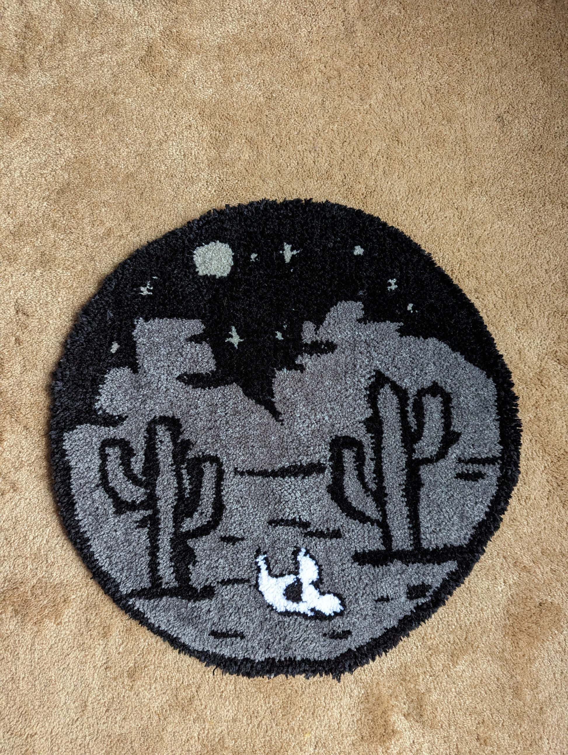 Custom hand-tufted rug made of acrylic yarn, approx. 28". Backed with non-slip felt. This little vignette adds a touch of desert class to any room in which it resides.